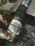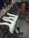 - Det skall lindas värmebeständig filt och isolerande avgasbandage på mina grenrör. Avgasbandaget kommer från Biltema. Jag har läst såväl fullständigt korkade som vettiga inlägg om detta på olika forum (både svenska och utrikiska), vilket föranlett att jag måste testa. Där sägs det att Biltemas band brinner, samt att man ska lägga bandaget i blöt innan man lindar för att: 1) Det ska dra ihop sig när det torkar. 2) det ska bli mer följsamt när man lindar. 3) Det ska bli mindre stickigt av glasfiberdammet på huden (och lungorna). Jag kan hittills konstatera följande: