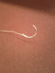 - För att låsa ändarna på alla de lager jag lindat så testade jag lite olika grejs. Här böjd stoppnål. Jag bankade najtråden så den gick in i ögat och sydde. Det gick sisådär. Många nålar gick sönder.