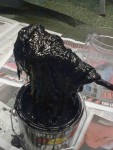 - Besvikelse nummer 3: Alldeles för sent gjorde jag en test hur smältlimmet beter sig. Limmade en liten klutt mellan en filtbit och en bandagebit och eldade på med gasolen. Det började brinna. Det brann och brann och brann…